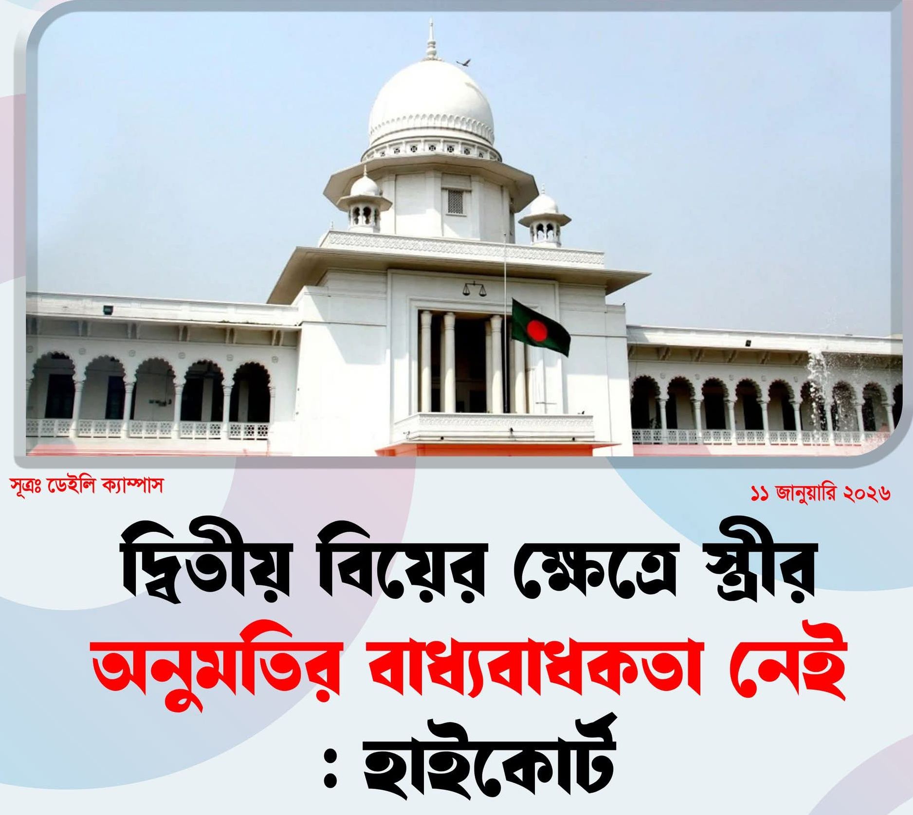 হাইকোর্টের এক রায়ে মুসলিম পারিবারিক আইনের আওতায় দ্বিতীয় বিয়ের ক্ষেত্রে ১ম স্ত্রীর অনুমতির বাধ্যবাধকতা নেই- হাইকোর্ট