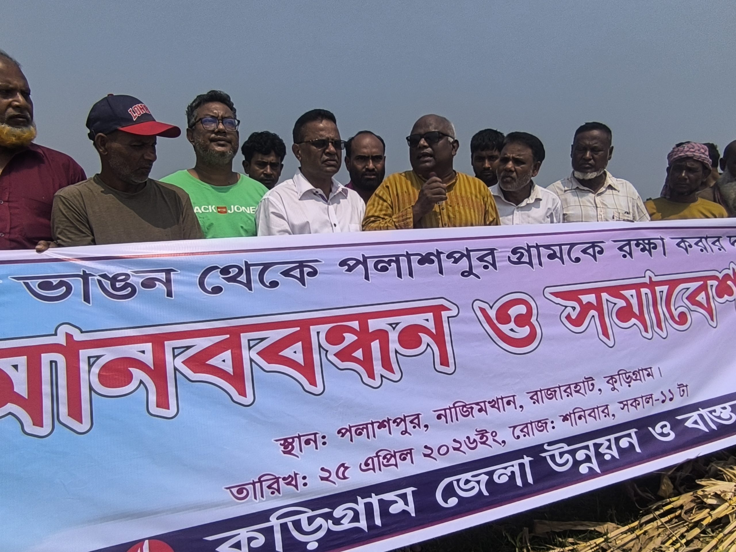 সমাবেশে অন্যান্য বক্তারা বলেন, পলাশপুর গ্রামকে রক্ষায় দ্রুত কার্যকর নদীশাসন প্রকল্প গ্রহণ করতে হবে। অন্যথায় ভাঙনে ক্ষতিগ্রস্তদের বসতভিটা ও জমির ন্যায্য ক্ষতিপূরণ নিশ্চিত করতে হবে।